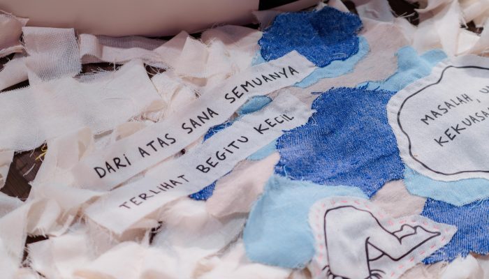 Berbagai jenis material seperti banner, tekstil, plastik, hingga limbah organik ditampilkan dalam proses transformasinya menjadi produk fungsional. Instalasi ceiling berbahan Tyvek yang terinspirasi dari lanskap Bantar Gebang dihadirkan dalam bentuk kanopi bergelombang, merepresentasikan tumpukan sampah sekaligus potensi yang tersembunyi di dalamnya. Pendekatan ini tidak hanya menghadirkan visual yang kuat, tetapi juga membangun pengalaman yang reflektif bagi pengunjung.