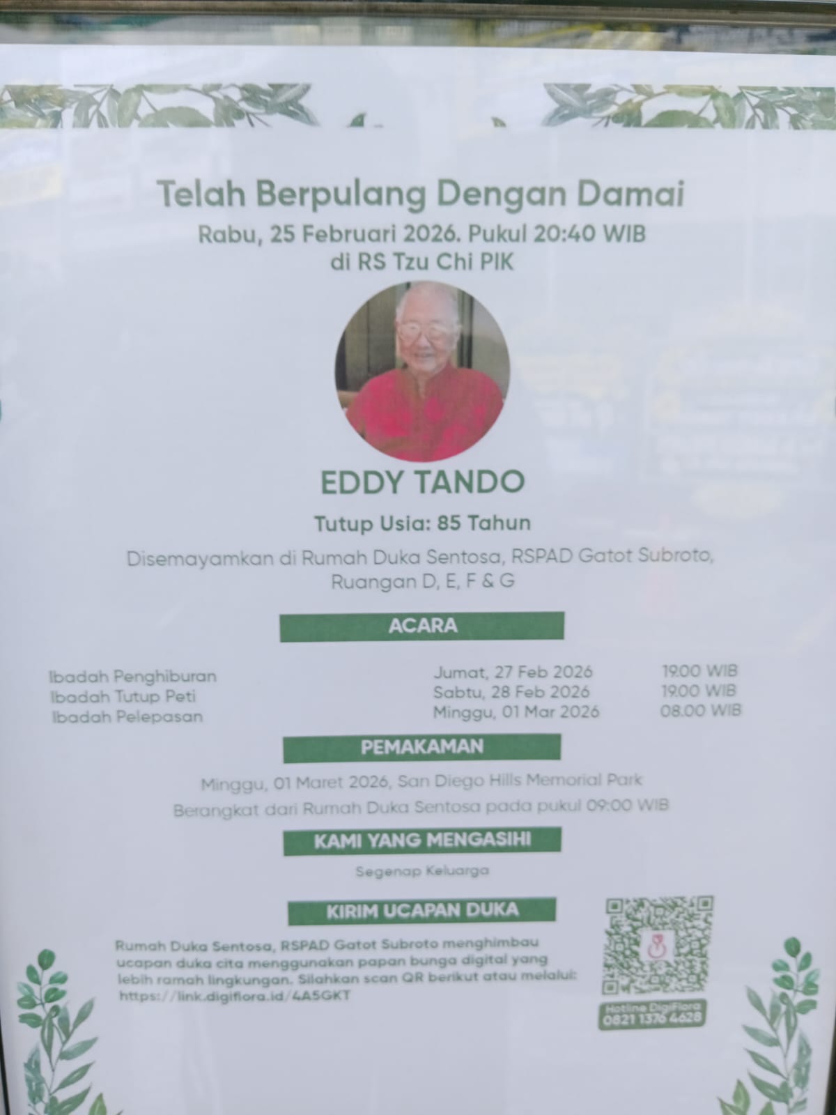Eddy Tando mengembuskan napas terakhir dalam usia 85 tahun. Kepergian almarhum meninggalkan duka mendalam bagi keluarga, kerabat, serta seluruh pihak yang mengenalnya sebagai sosok orang tua yang penuh kasih dan sederhana.